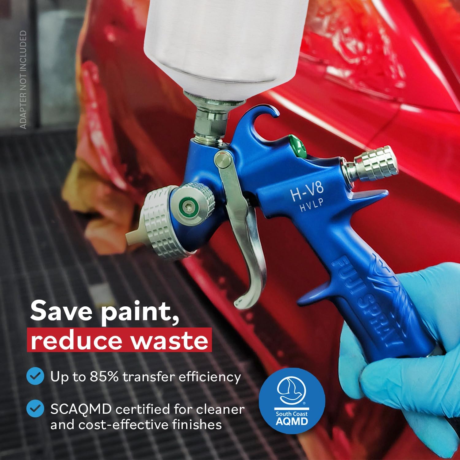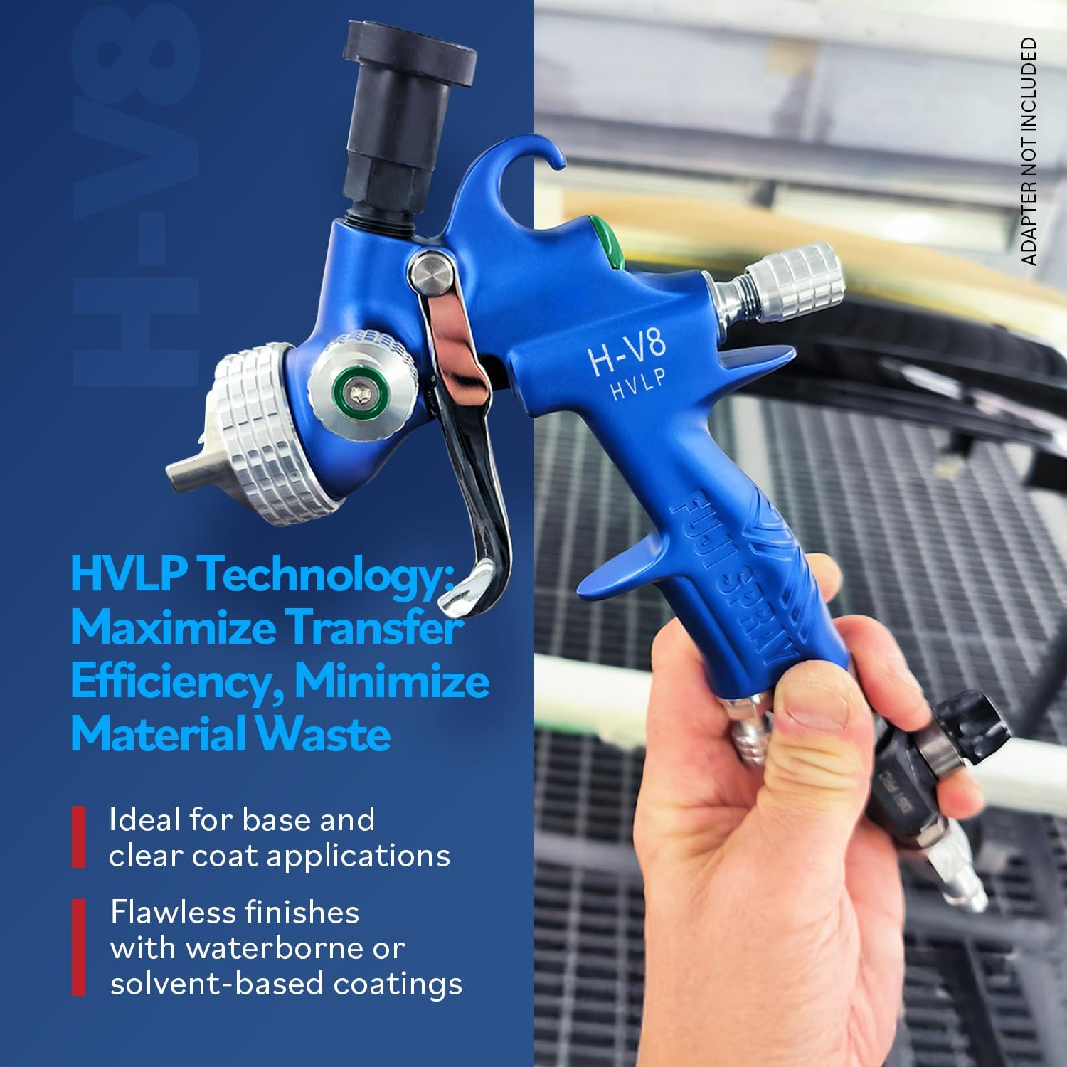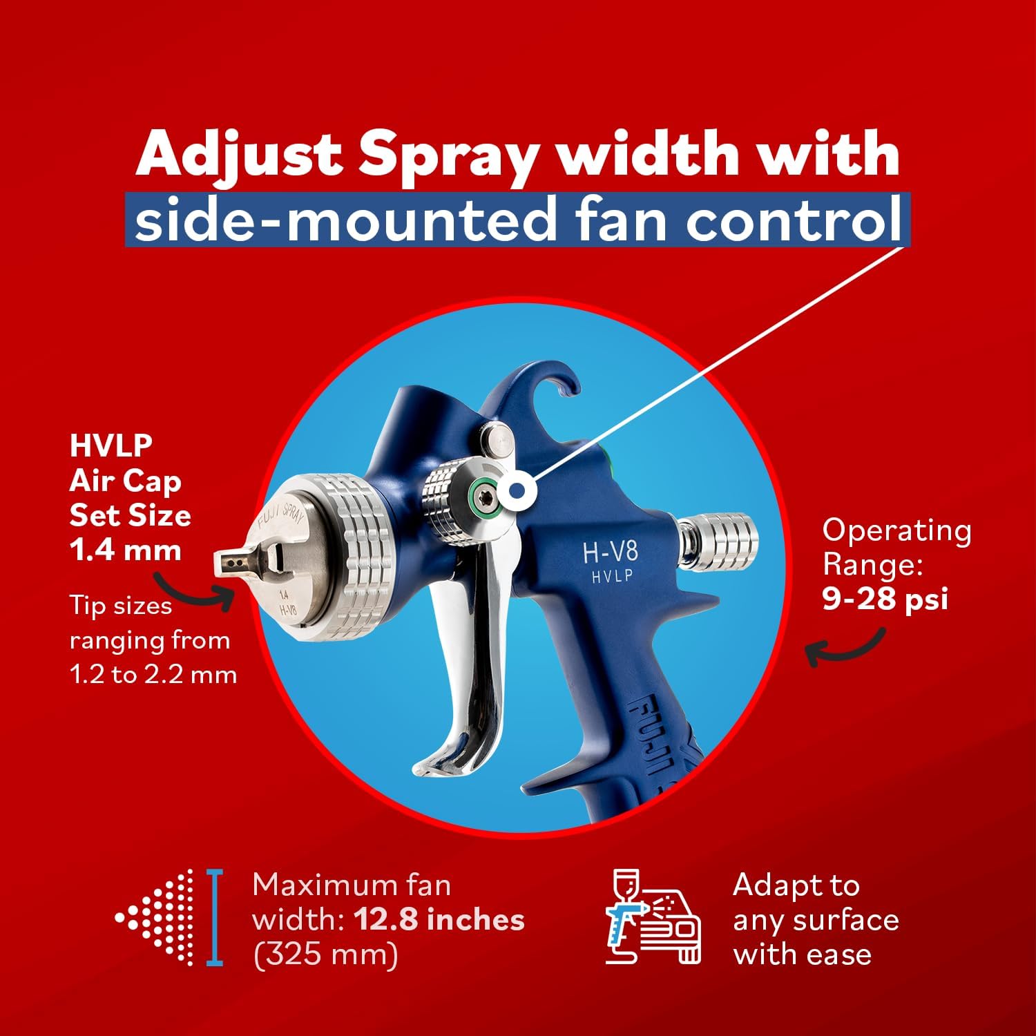 Best suited for base and clear coat applications, the H-V8™ features a precise side-mounted fan pattern control. The H-V8™ has few internal components, forged aluminum spray gun body with anodized fluid passages, and an optimized HVLP air cap resulting in a soft spray pattern.